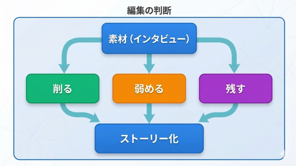 実際の編集現場では、インタビュー内容をそのまま使うことはほとんどありません。