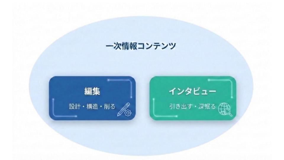 一次情報コンテンツは、インタビューだけでも、編集だけでも成立しません。インタビューで一次情報を掘り出し、編集でそれを意味のある構造に立ち上げることで、はじめて読者に届くコンテンツになります。